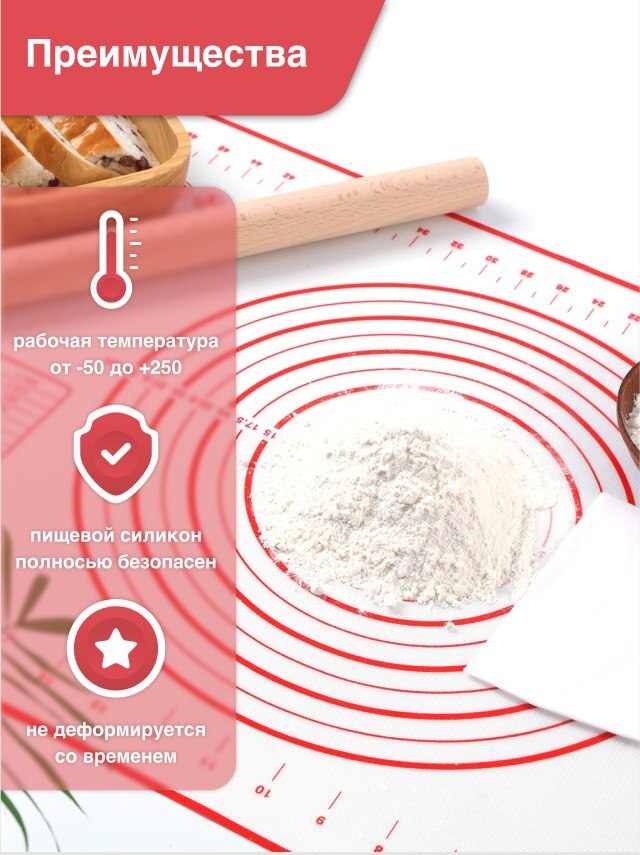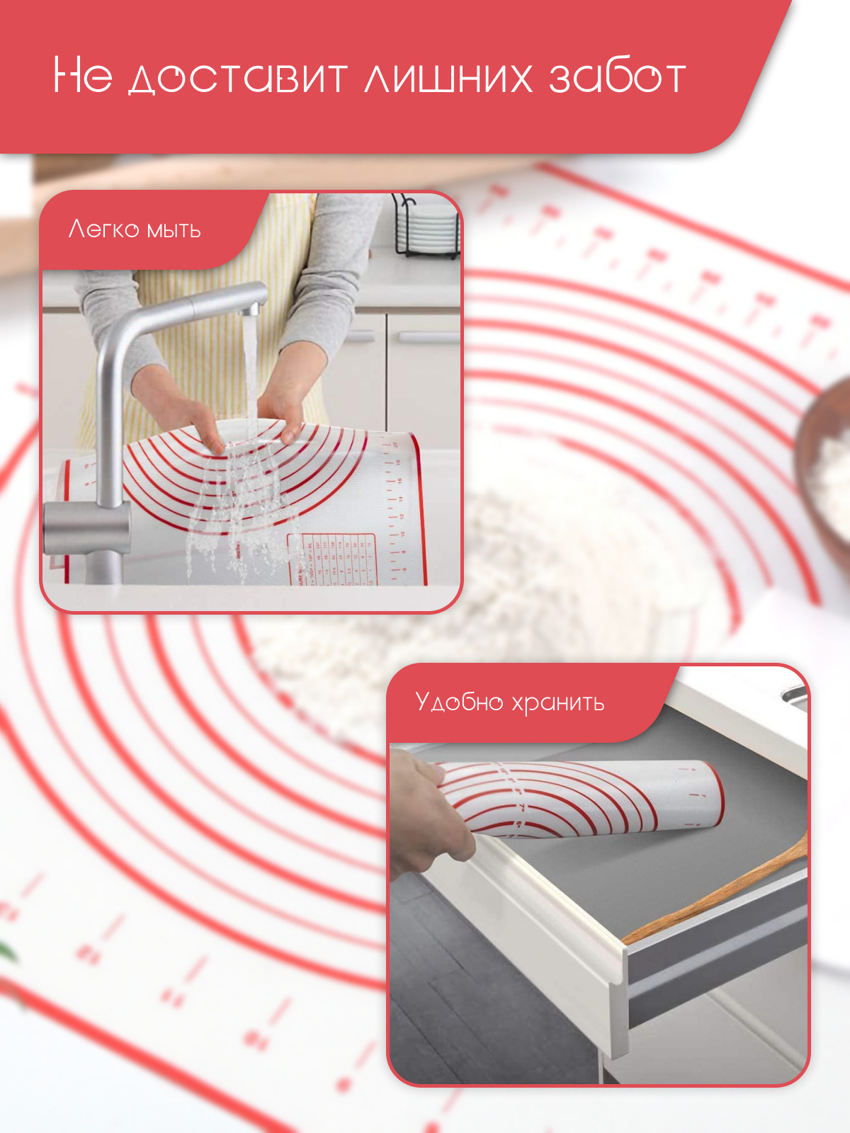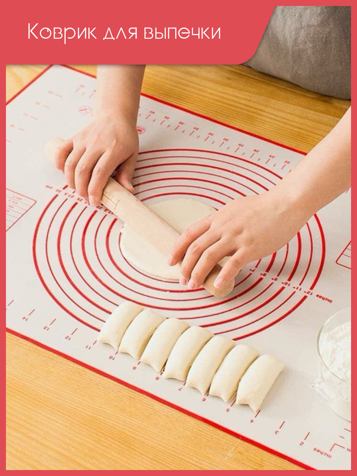 Коврик подходит для раскатки теста, тесто к нему не прилипает. Разметка на коврике нужна для того, чтобы раскатать пласт нужного размера. Коврик антипригарный и его можно использовать в духовом шкафу, выпекая прямо на нем. Мыть силиконовый коврик необходимо с помощью мягкой губки. При работе с ковриком для теста не рекомендуется использовать нож и острые предметы.